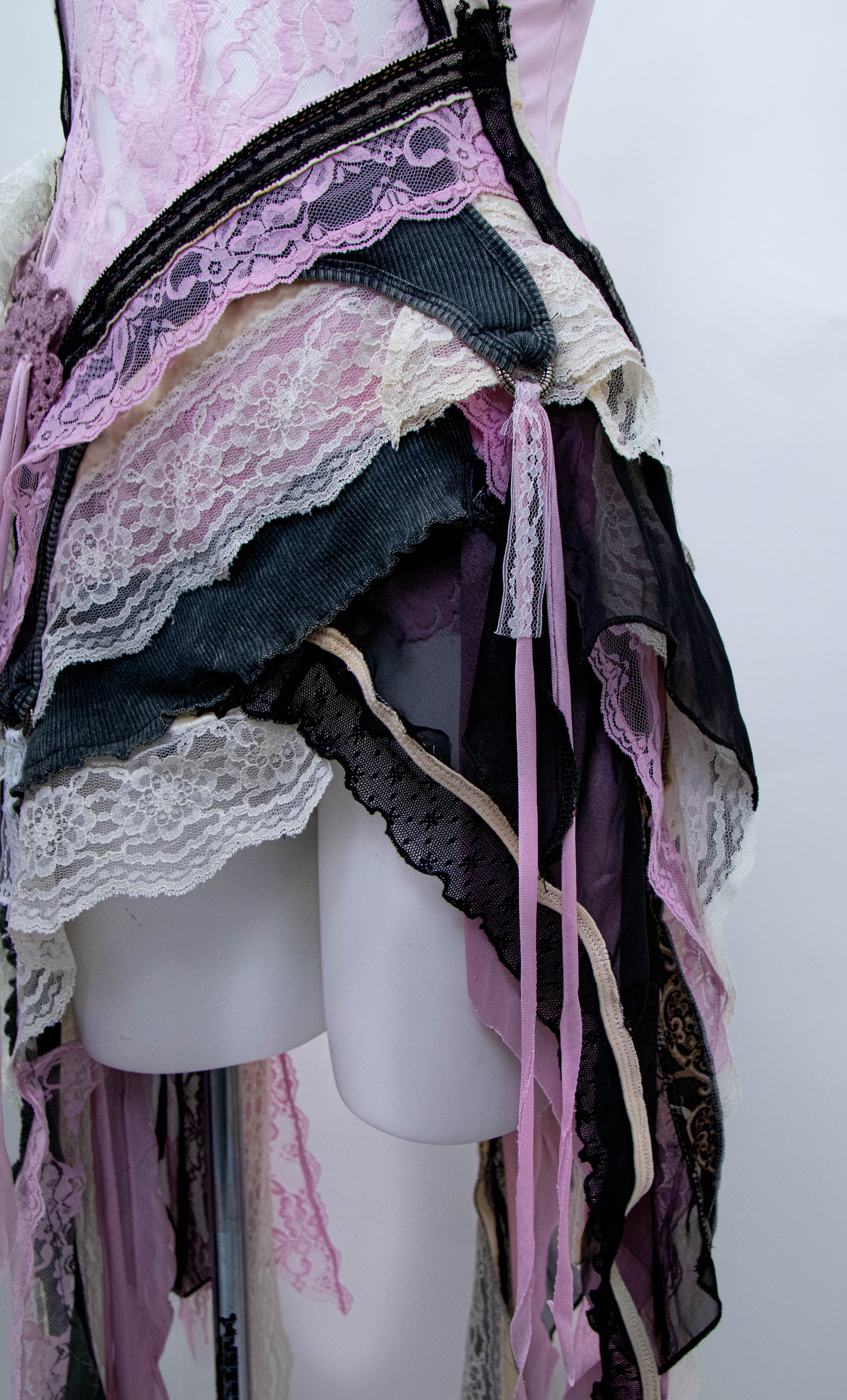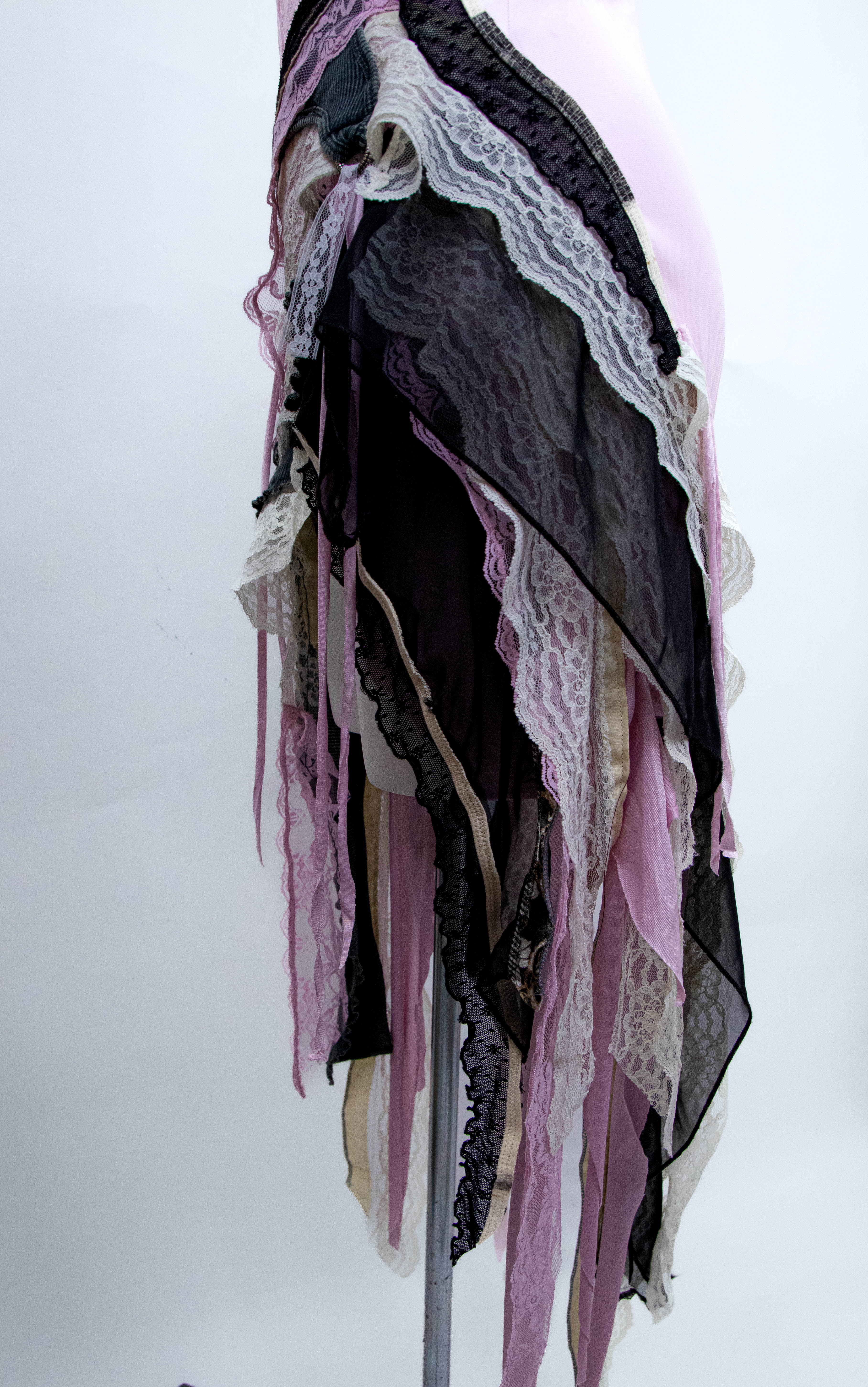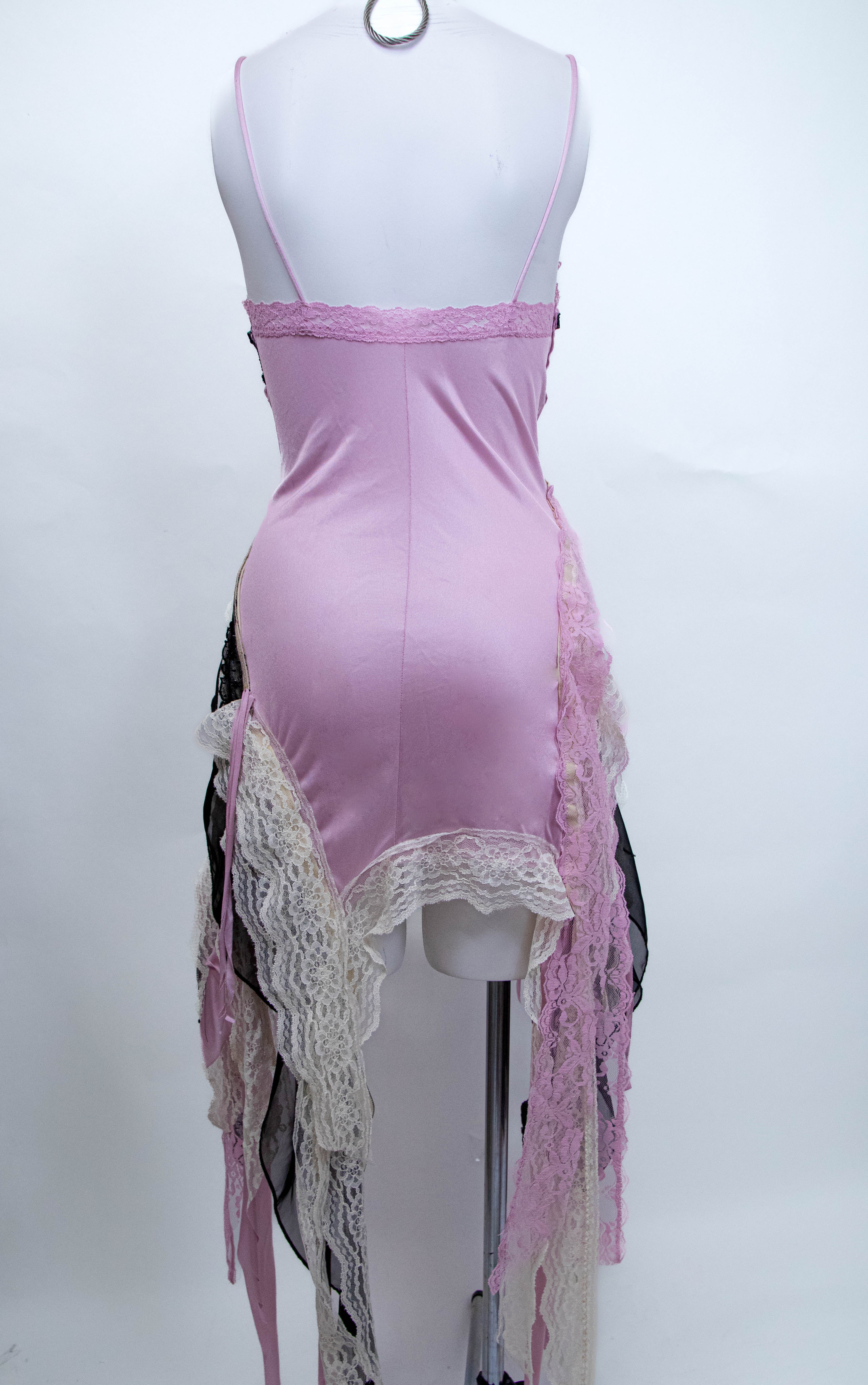 Pink and black lace asymmetrical dress. Features rhinestone cowl bust and flowing tendrils at the hips. Material is slightly sheer.