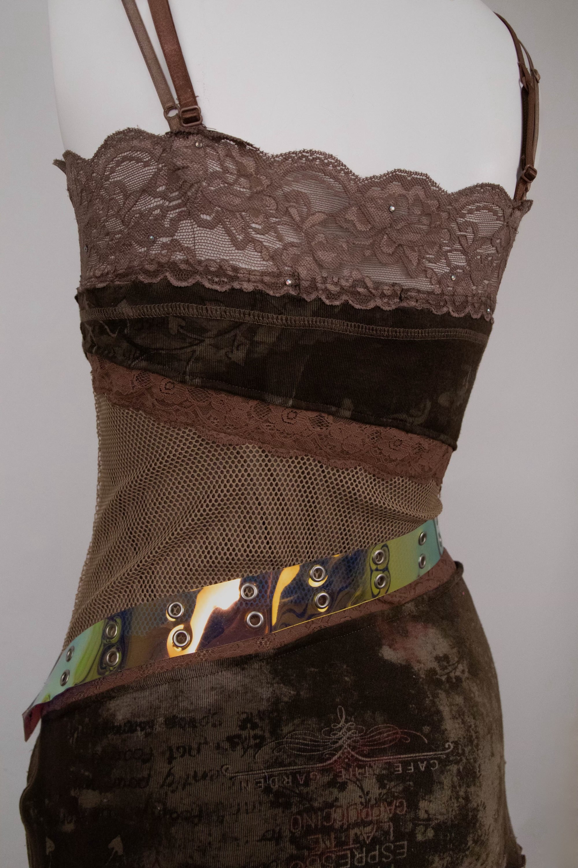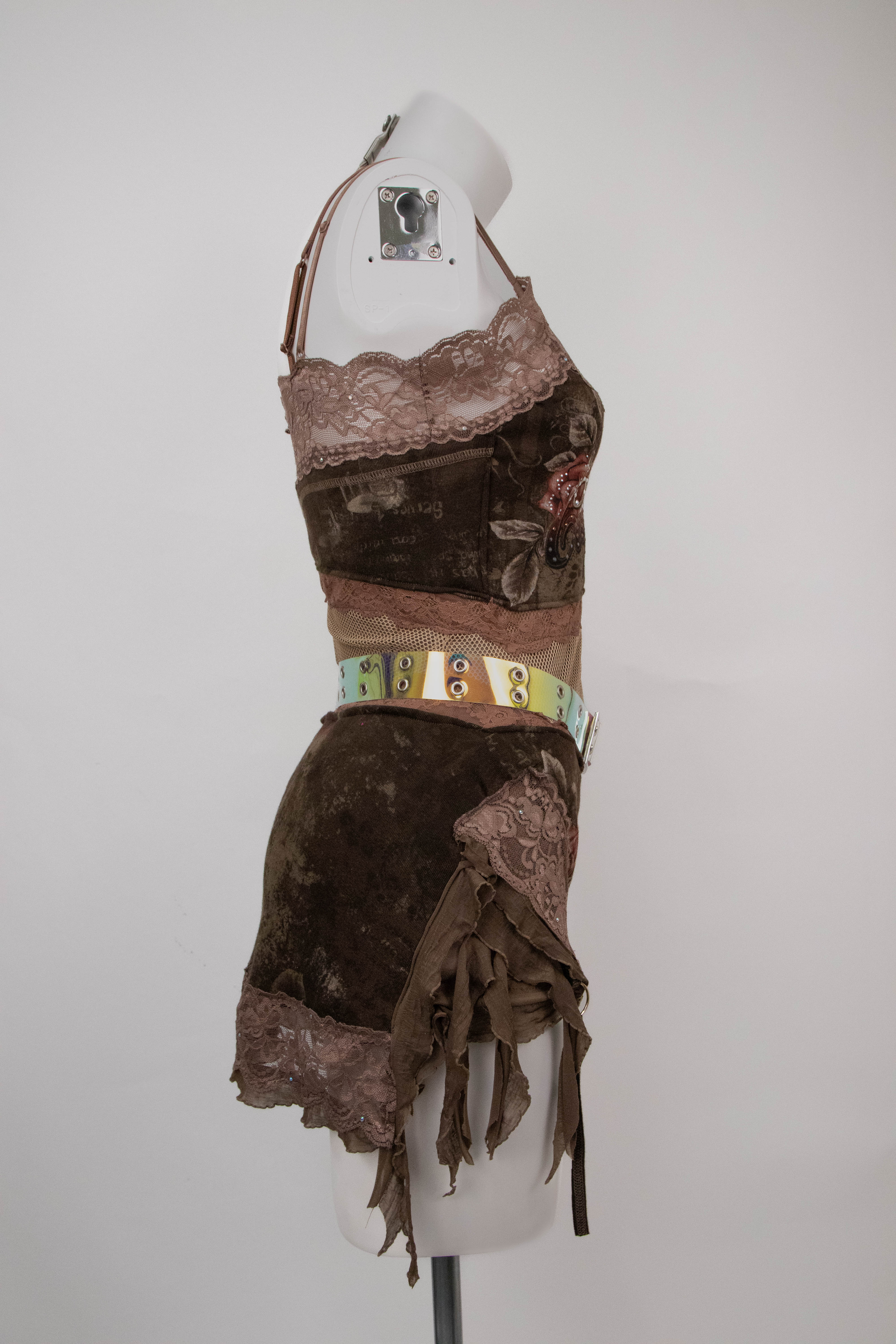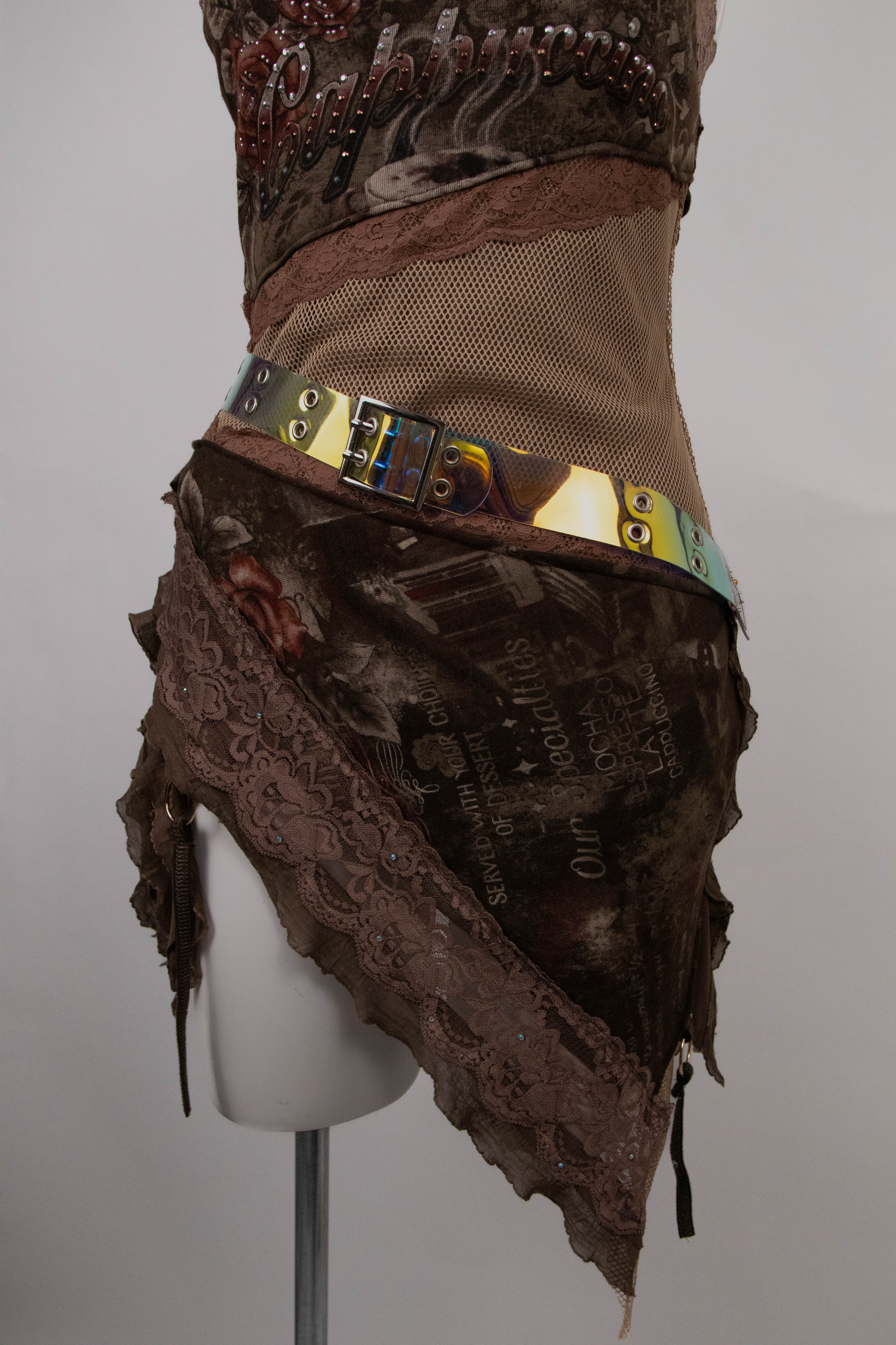 A cappuccino brown mini dress with an asymmetrical hem. Features a an iridescent detachable belt, rhinestones, flowy tendrils and lace trim.
