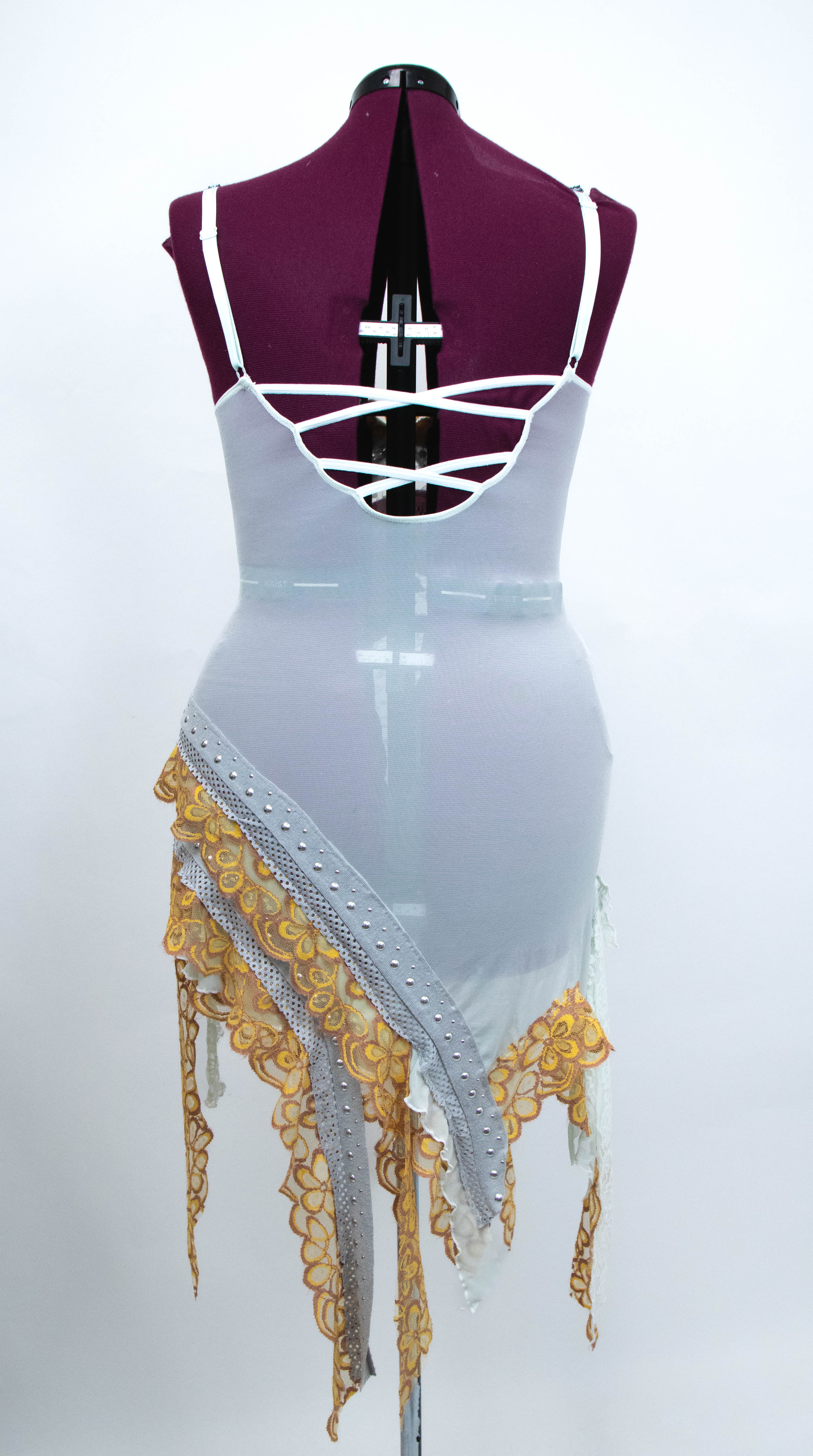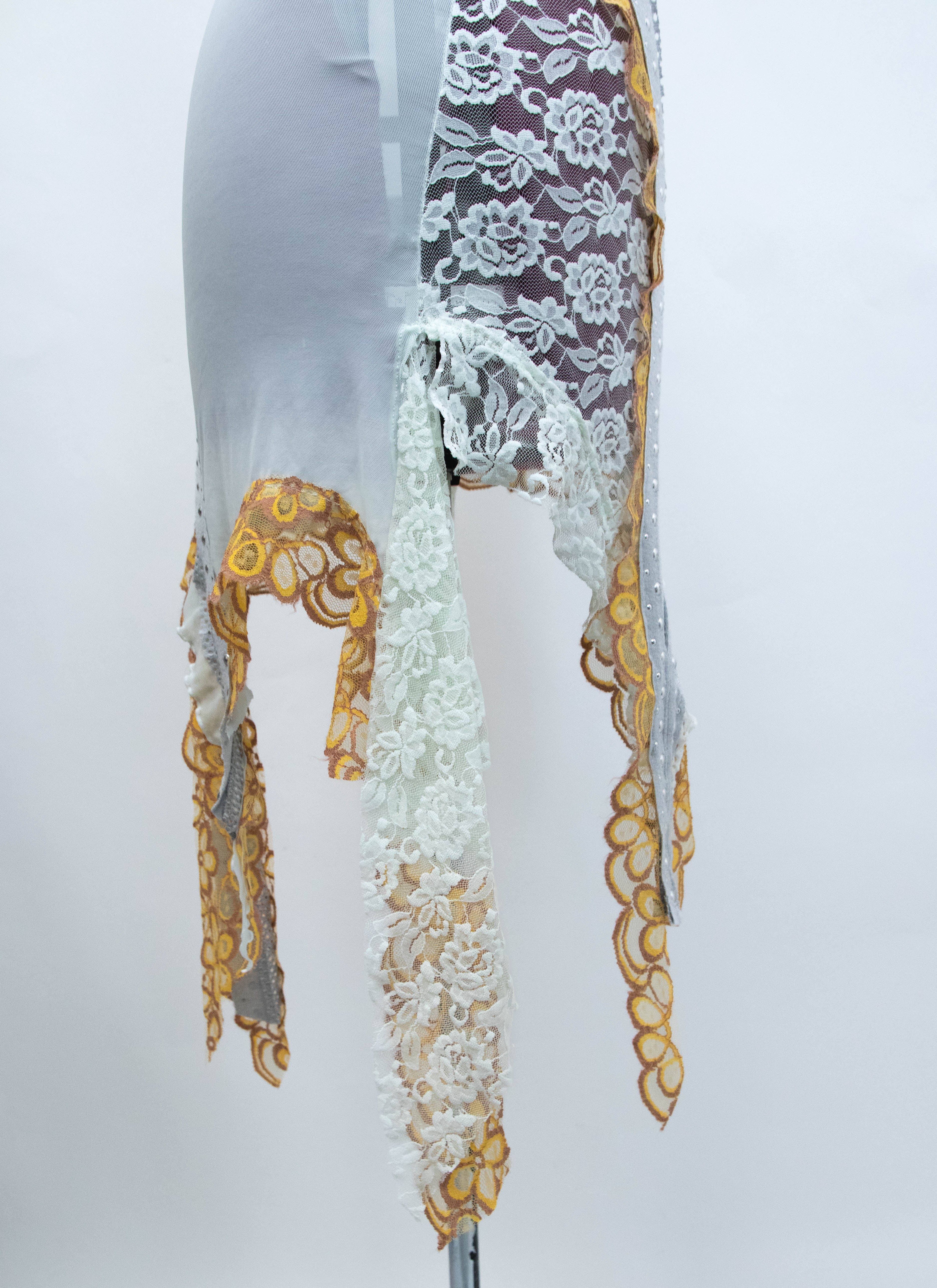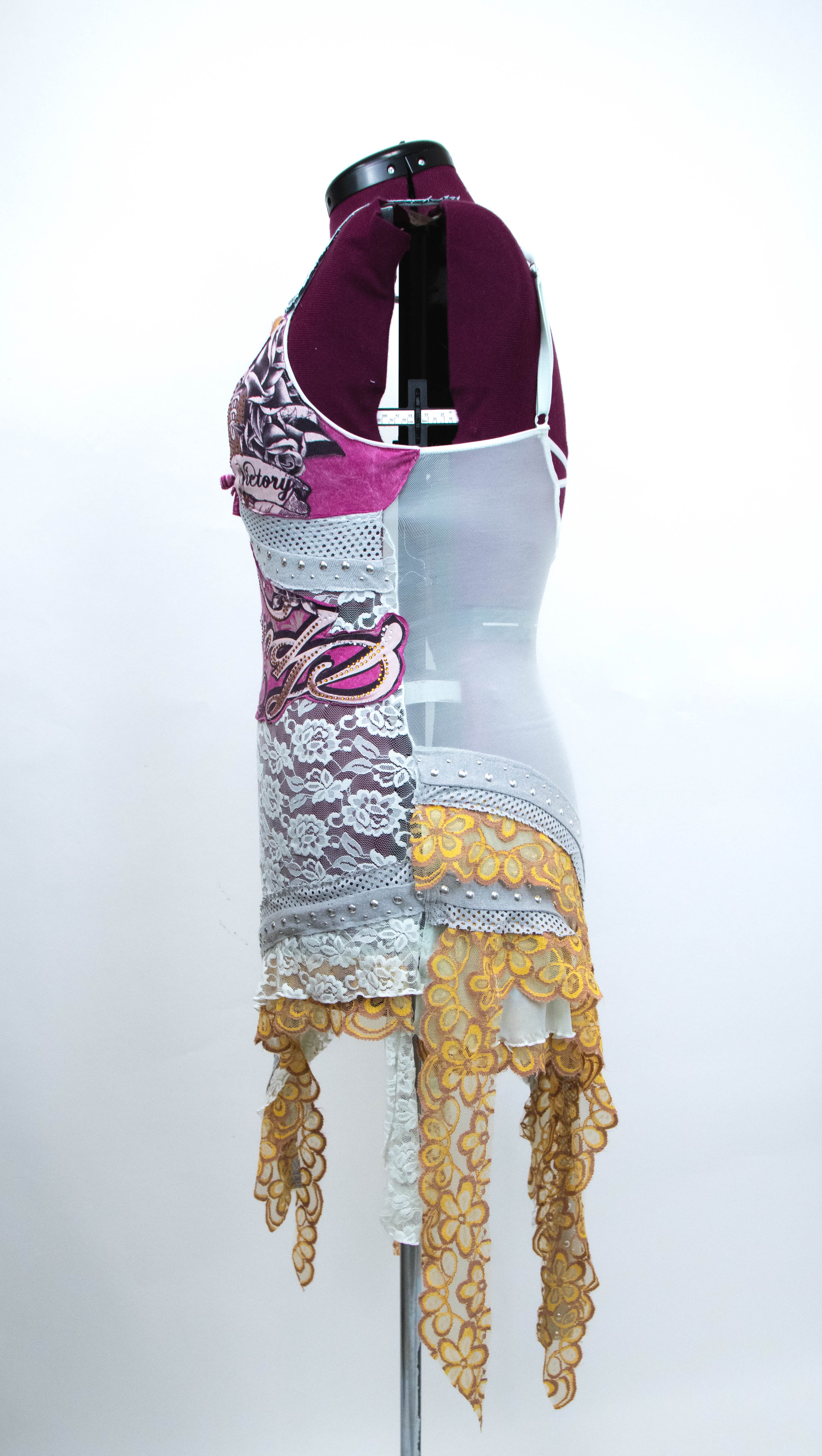 Pink and blue lace asymmetrical dress. Features rhinestones, bow detail at the bust, adjustable shoulder straps and flowing tendrils at the hips. Material is sheer and stretchy.
