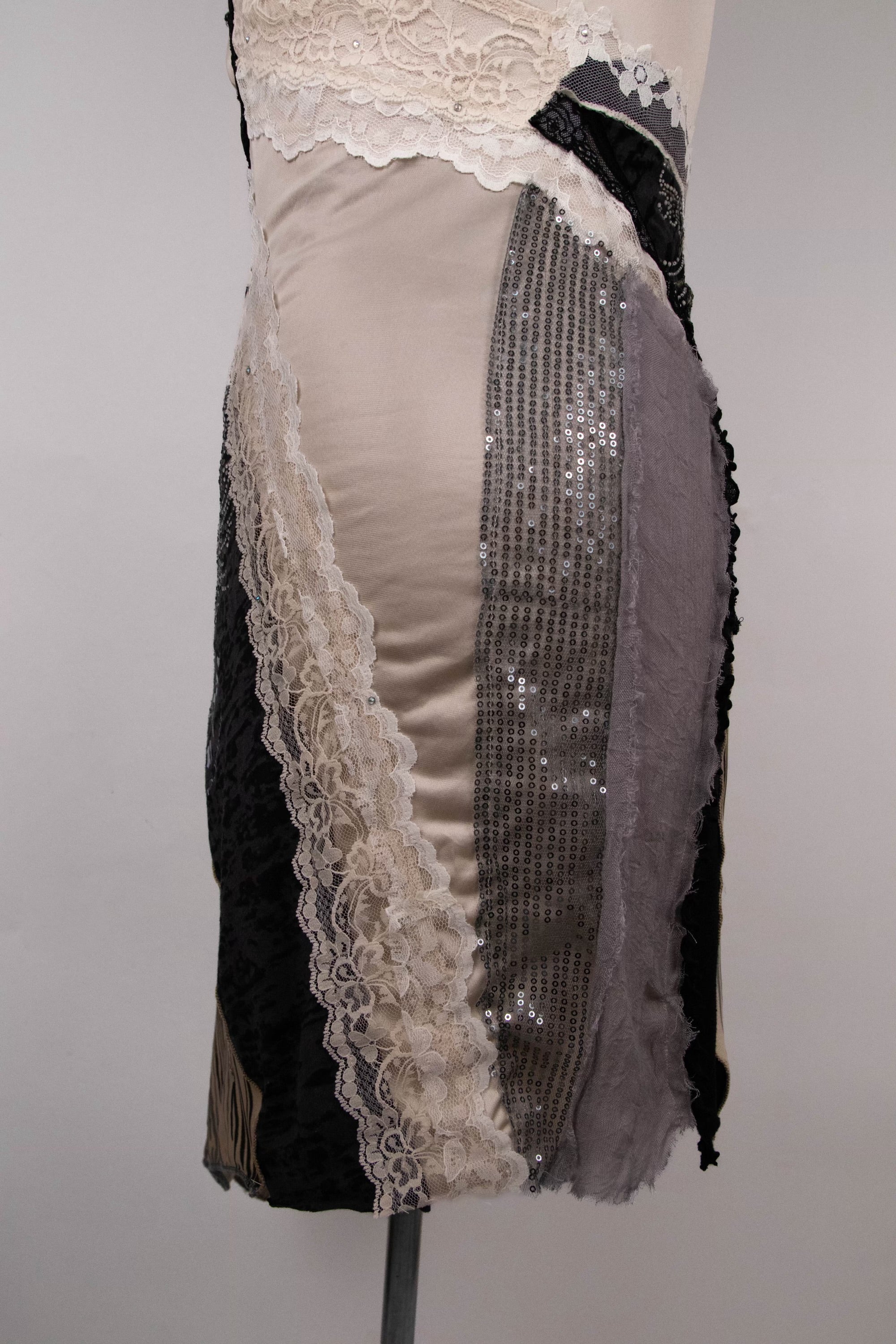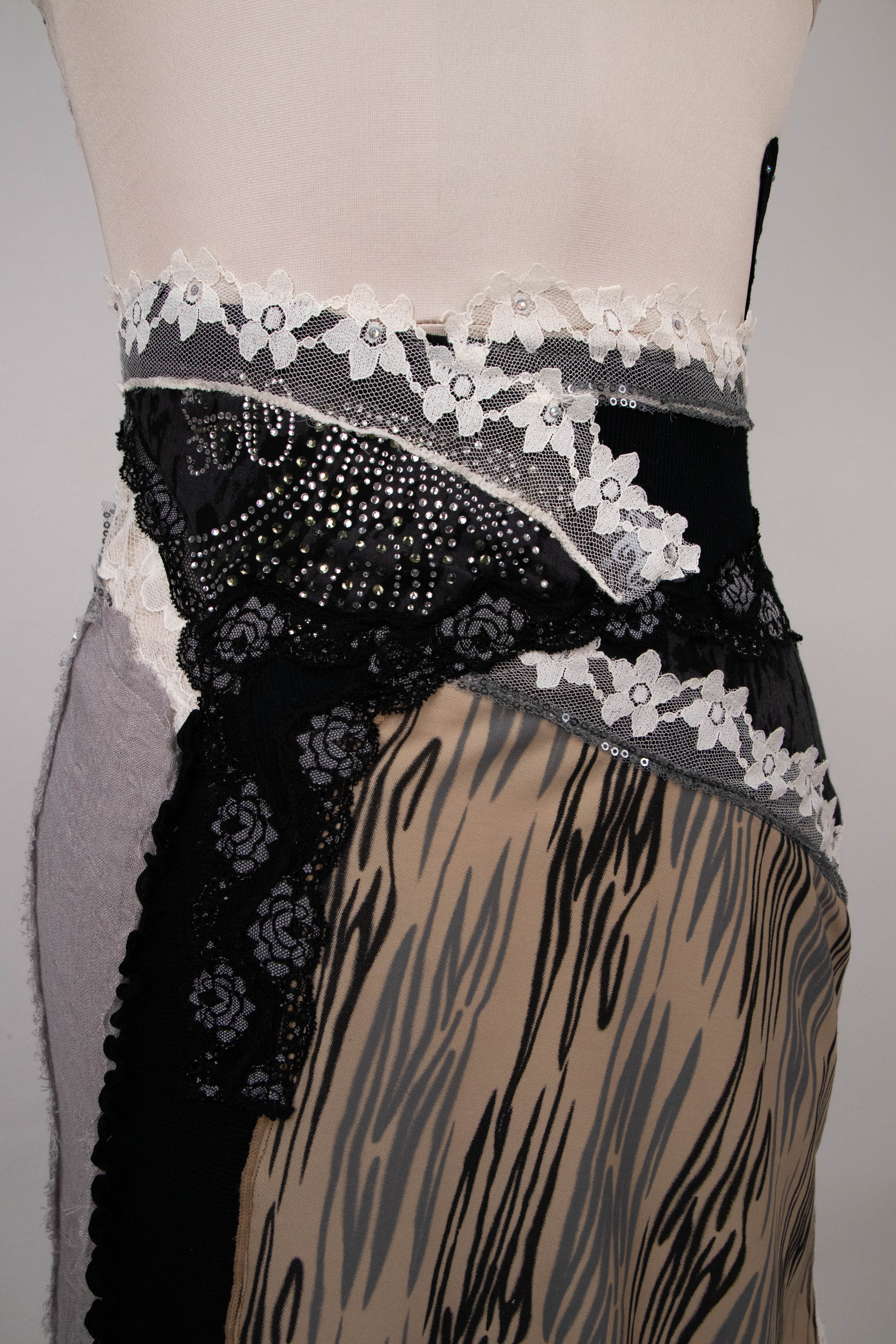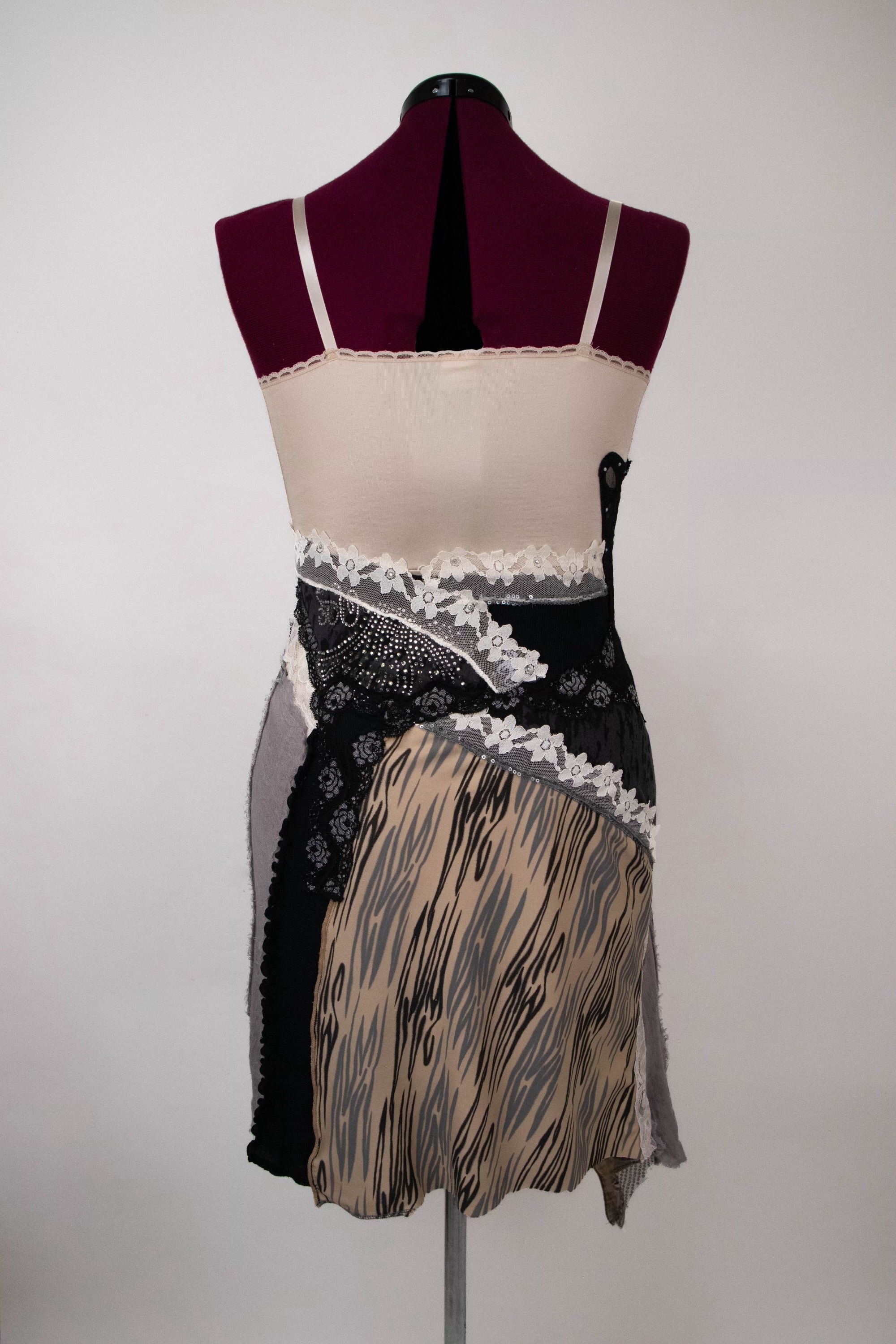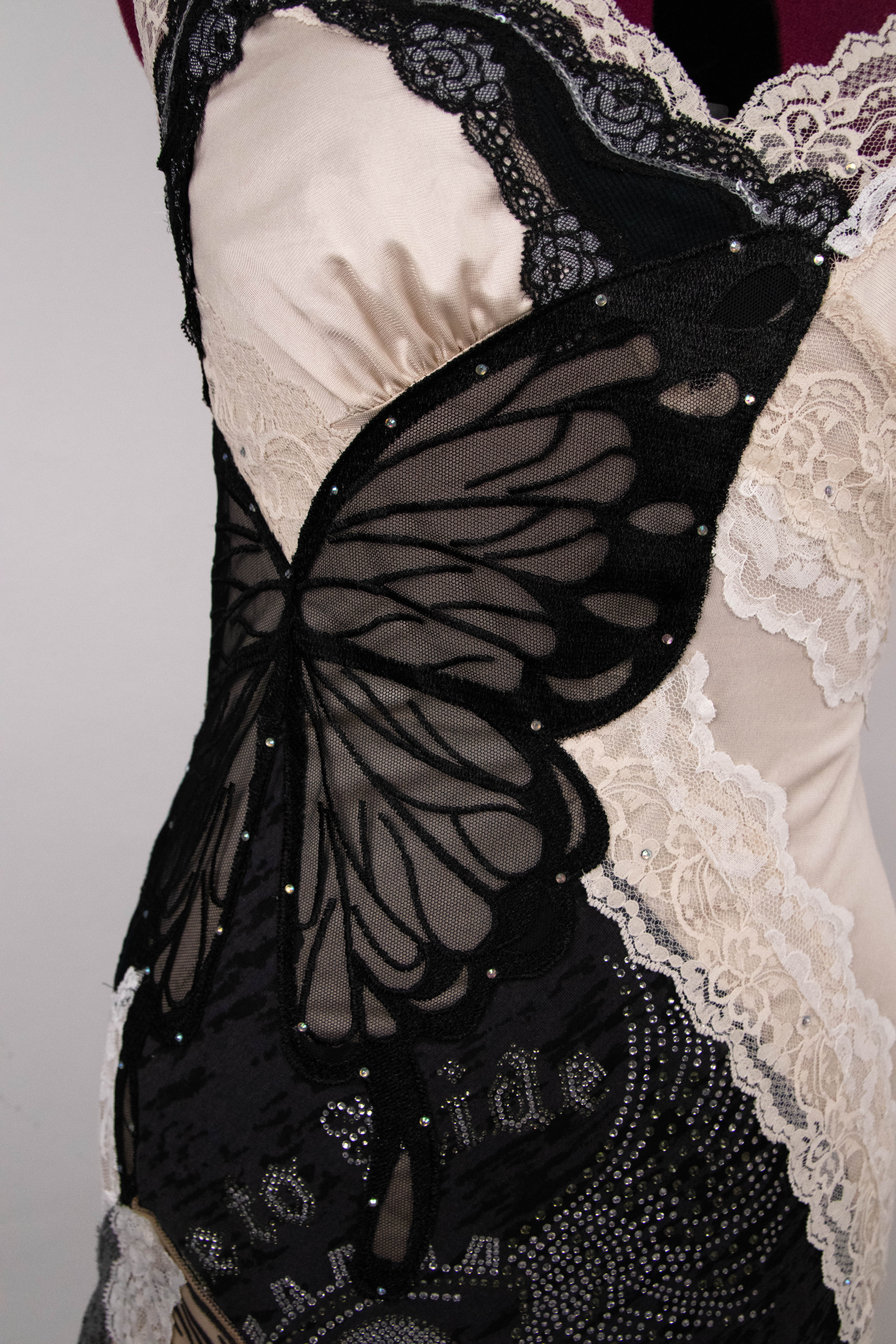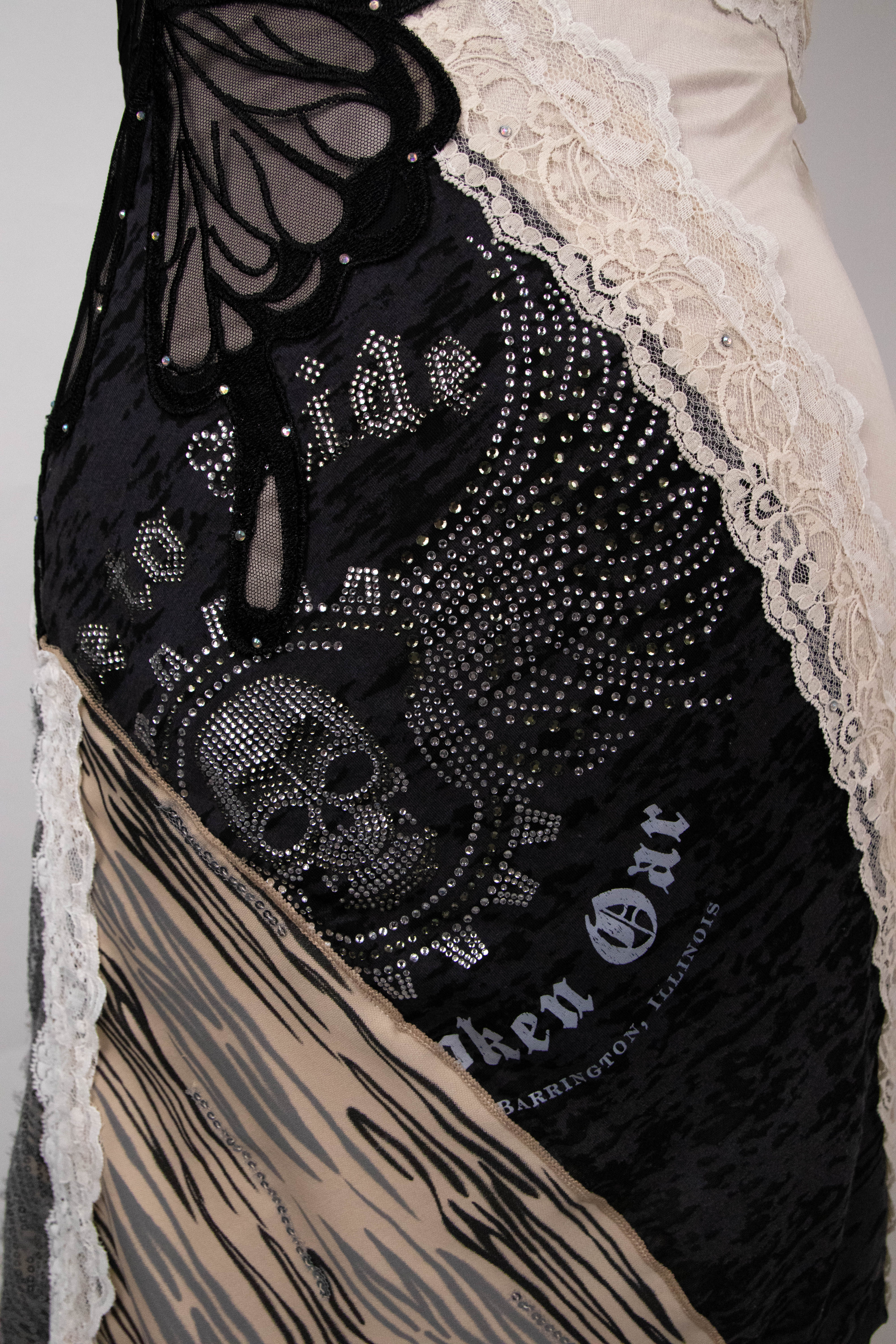 A cream and black dress with an asymmetrical hem. Features a butterfly applique, rhinestones, and lace details.